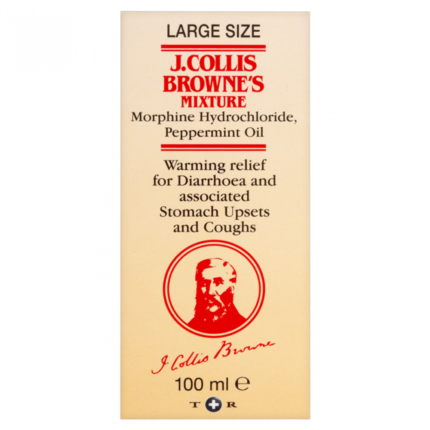 What is J.Collis Brownes Mixture? J. Collis Browne’s Mixture relieves coughs and the symptoms of diarrhoea. The medicine contains morphine
