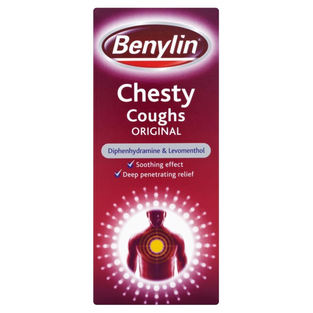 Benylin Chesty Coughs medicine contains the active ingredient diphenhydramine, which works as an antihistamine. This means that it helps to relieve coughing and secretions in your nose and chest which cause coughing. This product also contains levomenthol, which helps to clear congestion so you can breathe more easily.