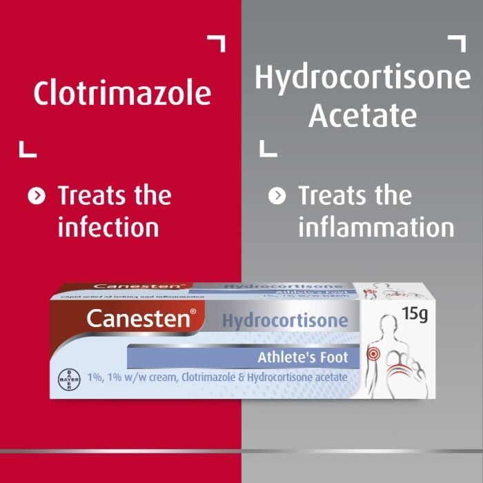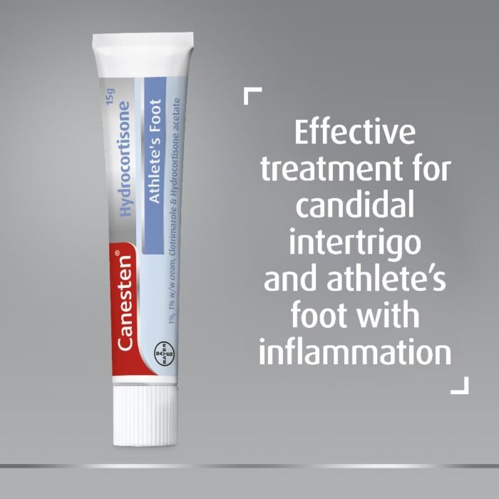 Canesten Hydrocortisone Cream is a treatment for athlete’s foot and fungal sweat rash. It is used when these conditions are accompanied by symptoms of inflammation such as swelling, redness and itching.