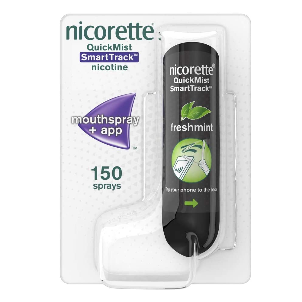 Nicorette QuickMist SmartTrack and Nicorette QuickMist are very similar products, both working as NRT mouth sprays, and the biggest difference between the two is the app connectivity. SmartTrack products can connect with the Nicorette Stop Smoking app to track your progress as you quit, while the regular QuickMist mouth sprays cannot. Another small difference to note is that Quickmist products are currently available in Freshmint and Cool Berry flavours, while SmartTrack is currently only available in Freshmint flavour.