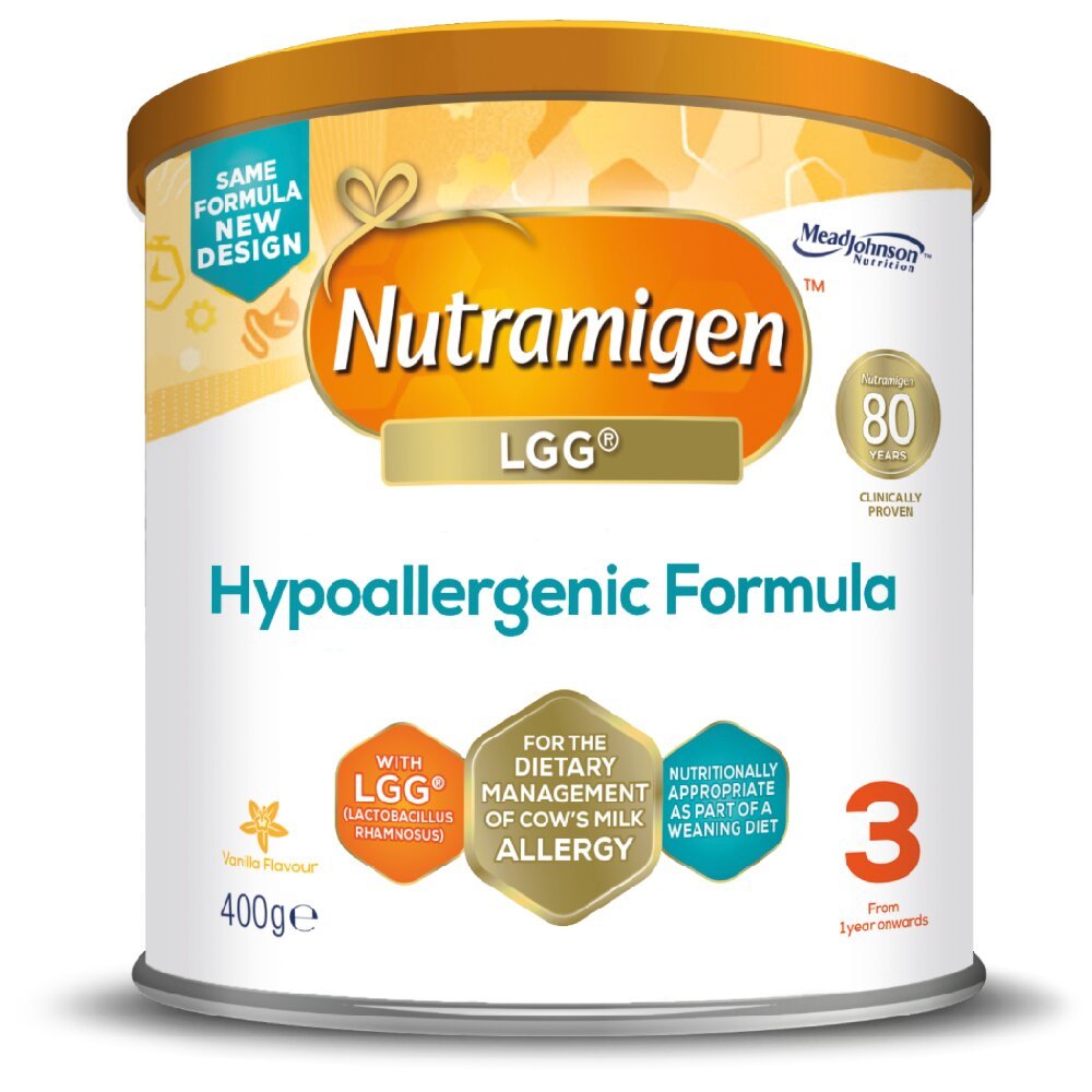 Nutramigen 3 with LGG® is extensively hydrolysed casein-based formula (eHCFs) combined with Lactobacillus rhamnosus GG (LGG®) a unique probiotic strain for the dietary management of infants aged from 6 months onwards with mild to moderate cows’ milk allergy. Nutramigen is the only hypoallergenic formula that contains this probiotic.